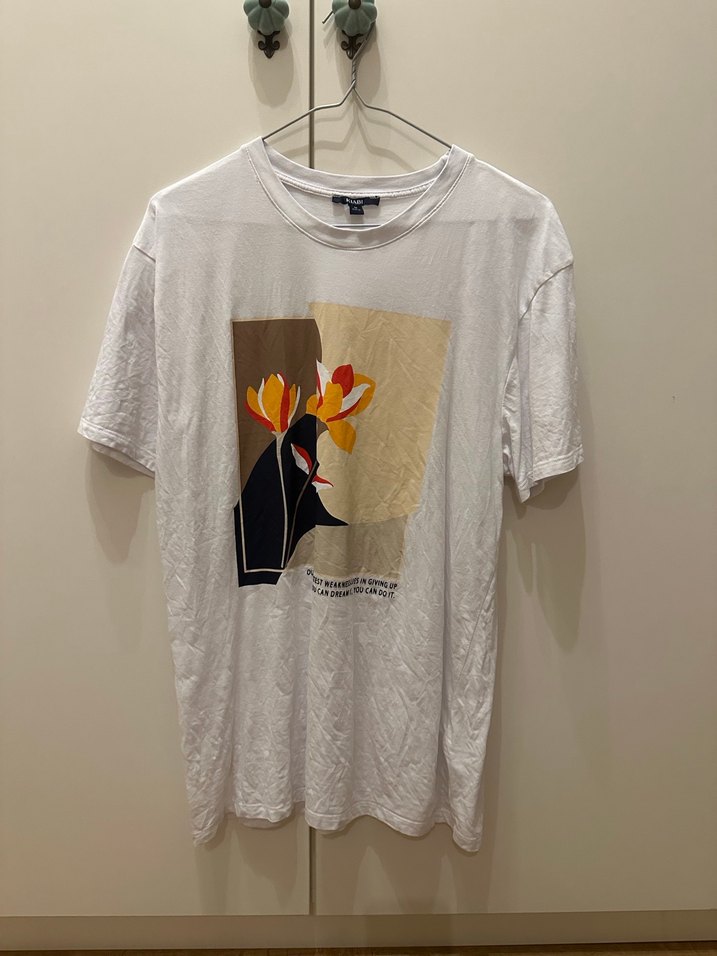 Beyaz %100 pamuklu tişört, kısa kollu ve yuvarlak yakalıdır. Ön kısmında koyu renkli sanatsal baskı bulunur, rahat kesimlidir. Günlük kullanım için uygundur.