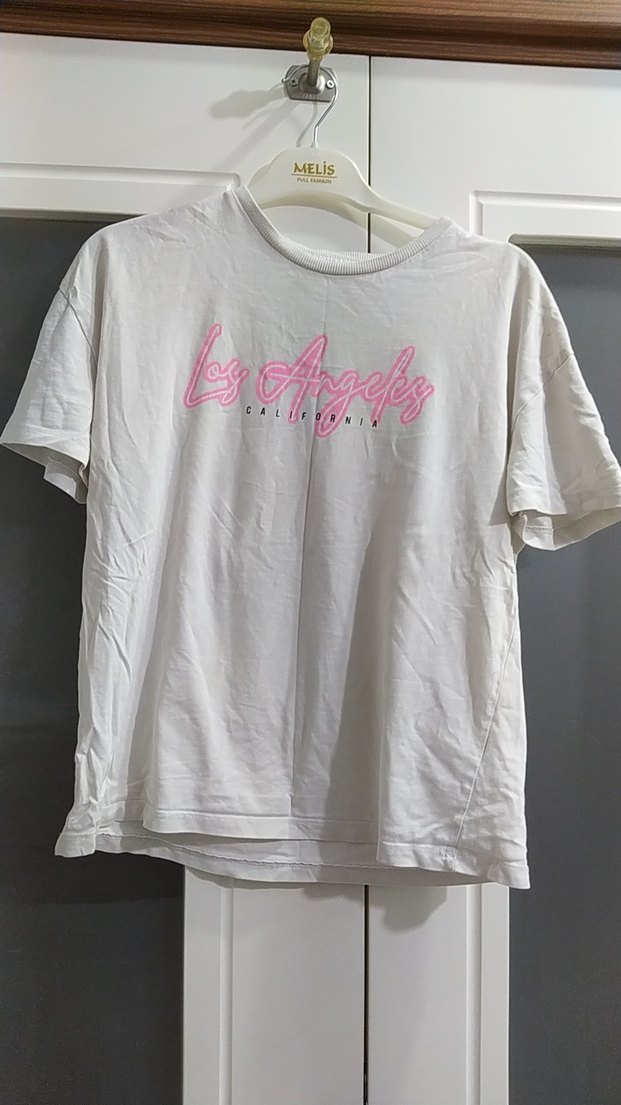 Beyaz pamuklu, kısa kollu, bisiklet yaka, gevşek kesim tişört, pastel pembe "Los Angeles" baskılı. Günlük kullanıma uygun.
