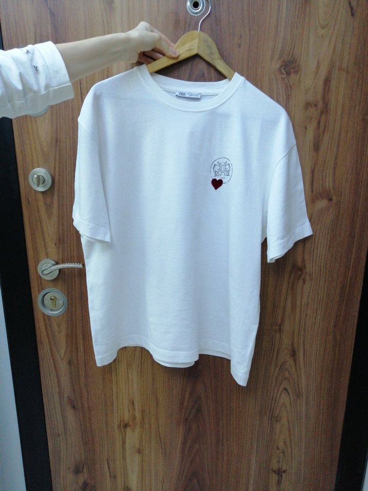 Beyaz pamuklu, kısa kollu, yuvarlak yaka, bol kesim tişört. Küçük baskılı detay ve rahat sokak tarzı sunar. Günlük kullanım için uygundur. Zara üründür. Alan memnun kalır