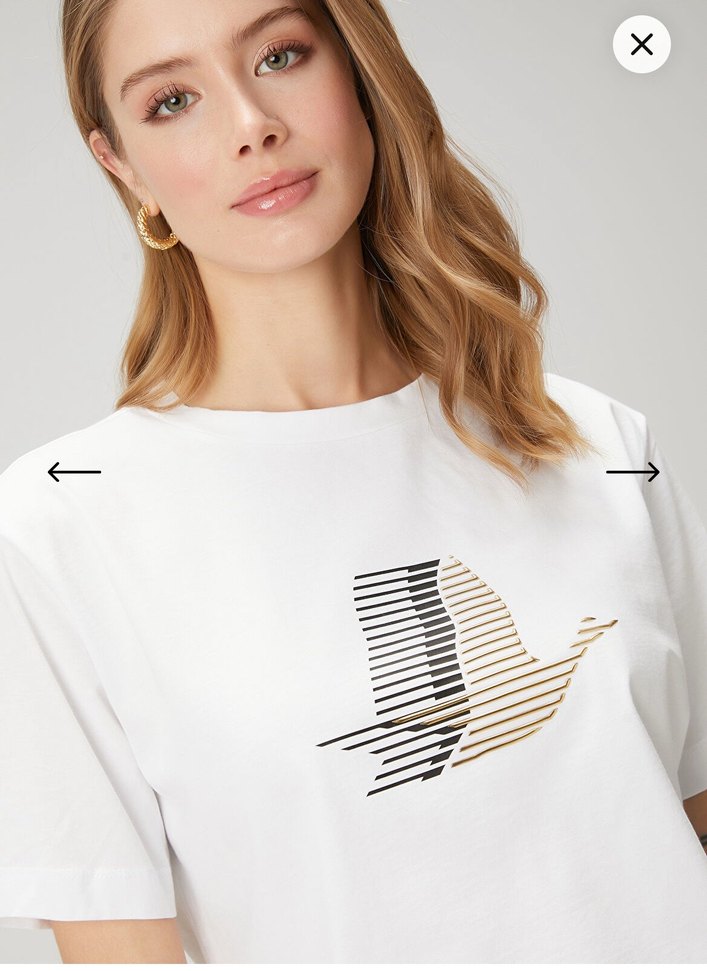 Beyaz pamuklu tişört, yuvarlak yaka ve kısa kollu. Parlak baskılı kuş deseniyle salaş, kısa kesim tarzında. Günlük rahatlık için uygundur.bir kez kullanıldı