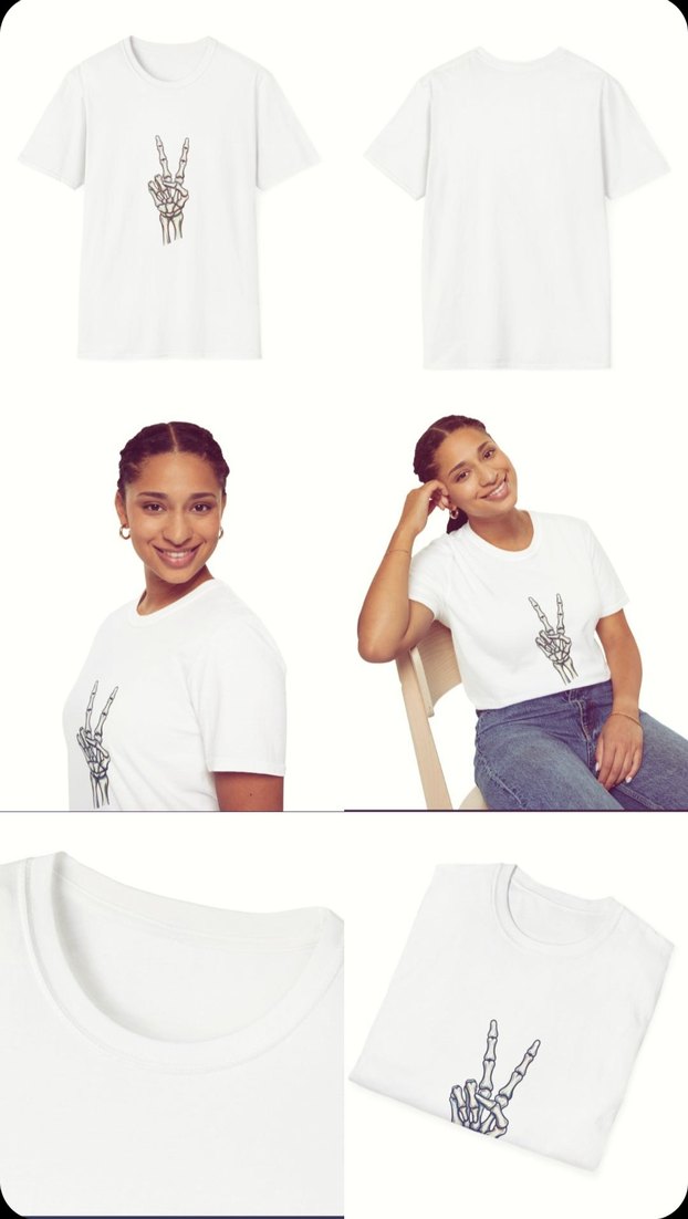 Beyaz pamuklu tişört, kısa kollu ve yuvarlak yakalıdır. Gri baskılı el işareti deseniyle rahat ve şık bir sokak stili sunar. ✌️