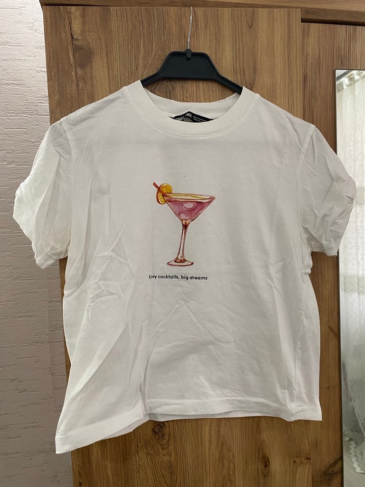 Pamuklu beyaz kısa kollu tişört, baskılı kokteyl deseni ve rahat kesimiyle gündelik kullanım için uygundur.