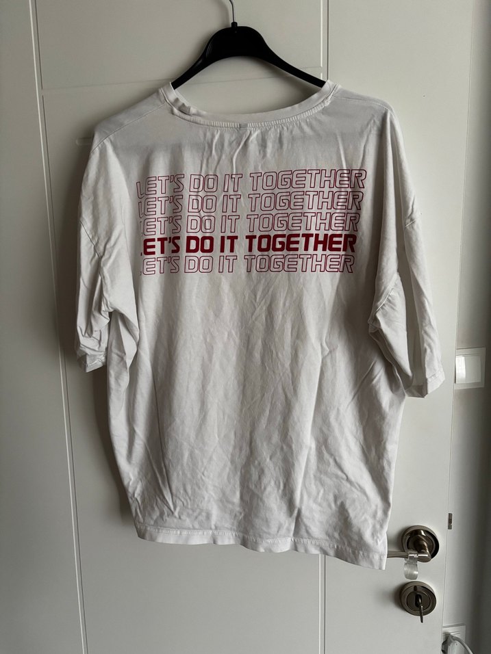 Pamuklu, beyaz, kısa kollu, bol kesim tişört. Önünde tekrar eden baskılı slogan bulunur. Günlük rahat ve trend sokak stili.