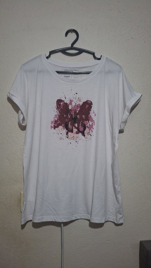 Beyaz pamuk tişört, kısa kollu, yuvarlak yakalı ve bol kesimdir. Pastel tonlarda kelebek baskısı ile rahat ve şık bir günlük sokak stili sunar.