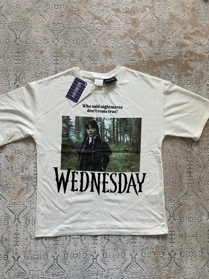 Beyaz pamuklu tişört, kısa kollu ve salaş kesimdir. Üzerinde 'WEDNESDAY' ve 'Who said nightmares don't come true?' yazılı baskı vardır. Günlük rahat stil için uygundur.