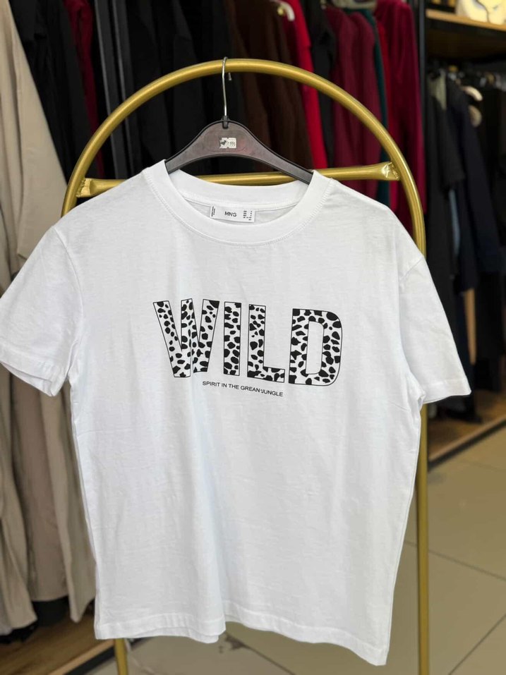 Beyaz, kısa kollu, yuvarlak yaka, bol kesim kadın tişörtü. Üzerinde "WILD" baskısı bulunur. Pamuklu, rahat ve günlük kullanım için uygundur.