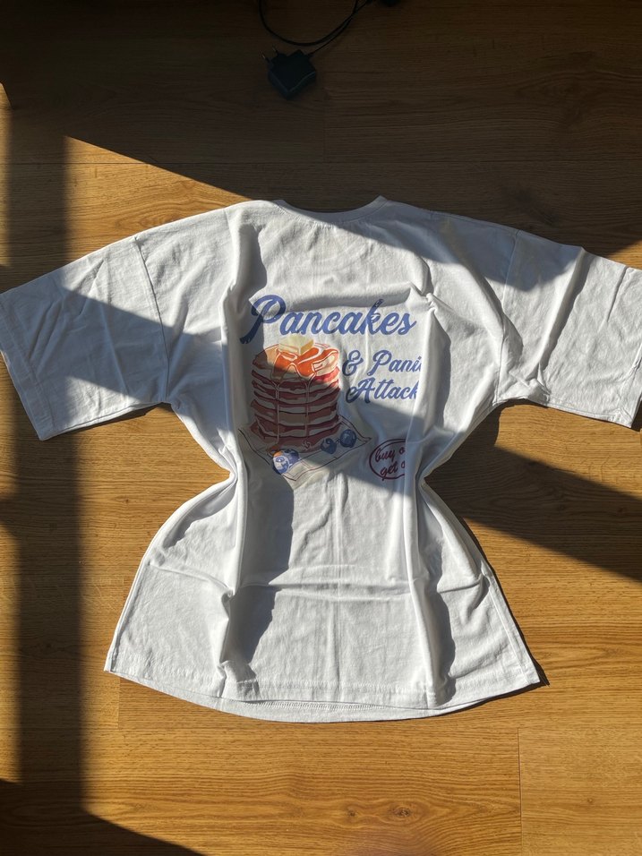Oversize tisort aldigim gibi duruyor tisort giymedigim icin satiyorum.Beyaz pamuklu tişört, kısa kollu, yuvarlak yakalı ve bol kesimdir. Sırtında pankek baskısı bulunur, rahat sokak stiline uygundur.