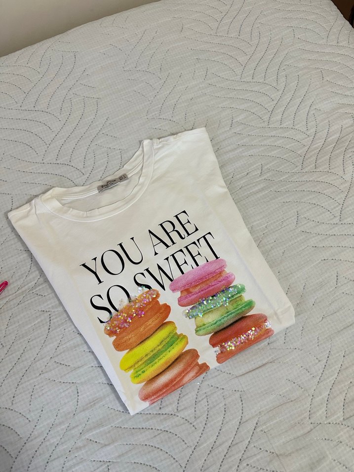 Beyaz pamuklu kadın tişört, renkli makaron baskısı ve "YOU ARE SO SWEET" yazısı ile. Kısa kollu, yuvarlak yaka, bol kesim ve fırfır detaylıdır. Parti için uygun.