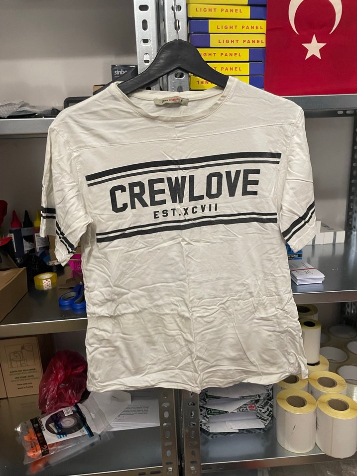Beyaz renkli, pamuklu, kısa kollu, bol kesim tişört. Renkli baskılı ve Velcro detaylıdır. Günlük rahat sokak stili için uygundur. CREWLOVE, EST.XCVII yazılıdır.