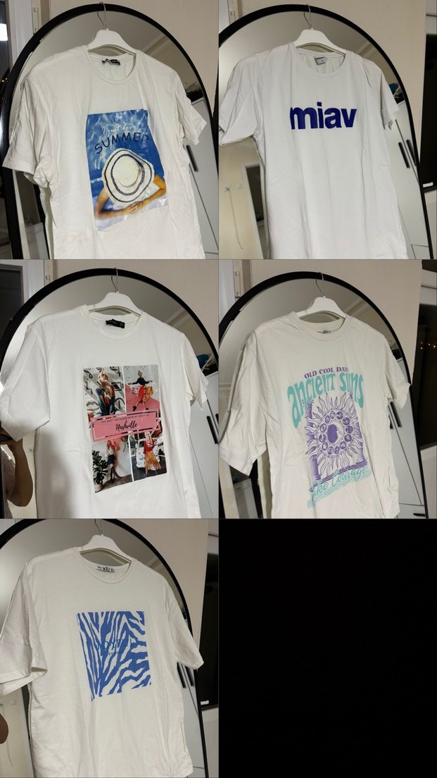 Pamuklu beyaz kısa kollu tişörtler çeşitli baskılı desenlerle, salaş kesim ve mini boyda. Yuvarlak yaka, günlük rahat kullanım için uygun. 5 tanesi birlikte