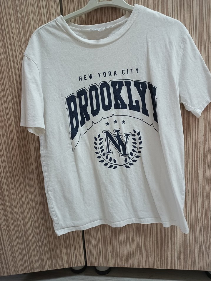 Beyaz pamuk kısa kollu tişört, bol kesim ve baskılı Brooklyn tasarımlı. Yuvarlak yaka ve rahat sokak stili.