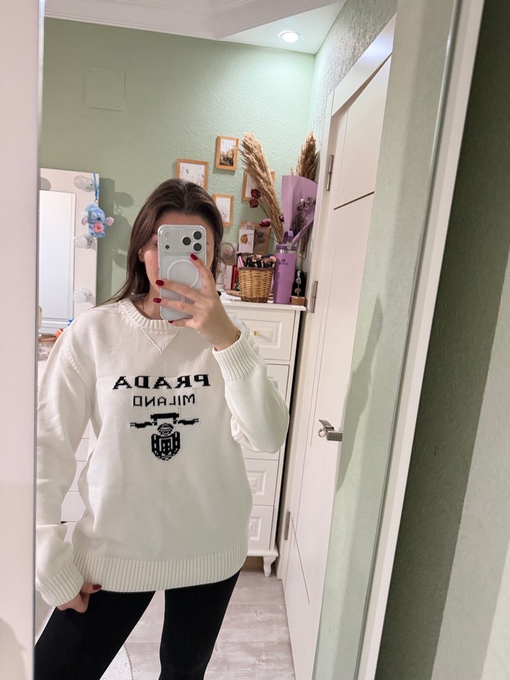 Uzun kollu, bisiklet yaka, bol kesim beyaz triko kazak. Ön kısmında baskı deseni bulunur, midi boy ve günlük rahat kullanıma uygundur.