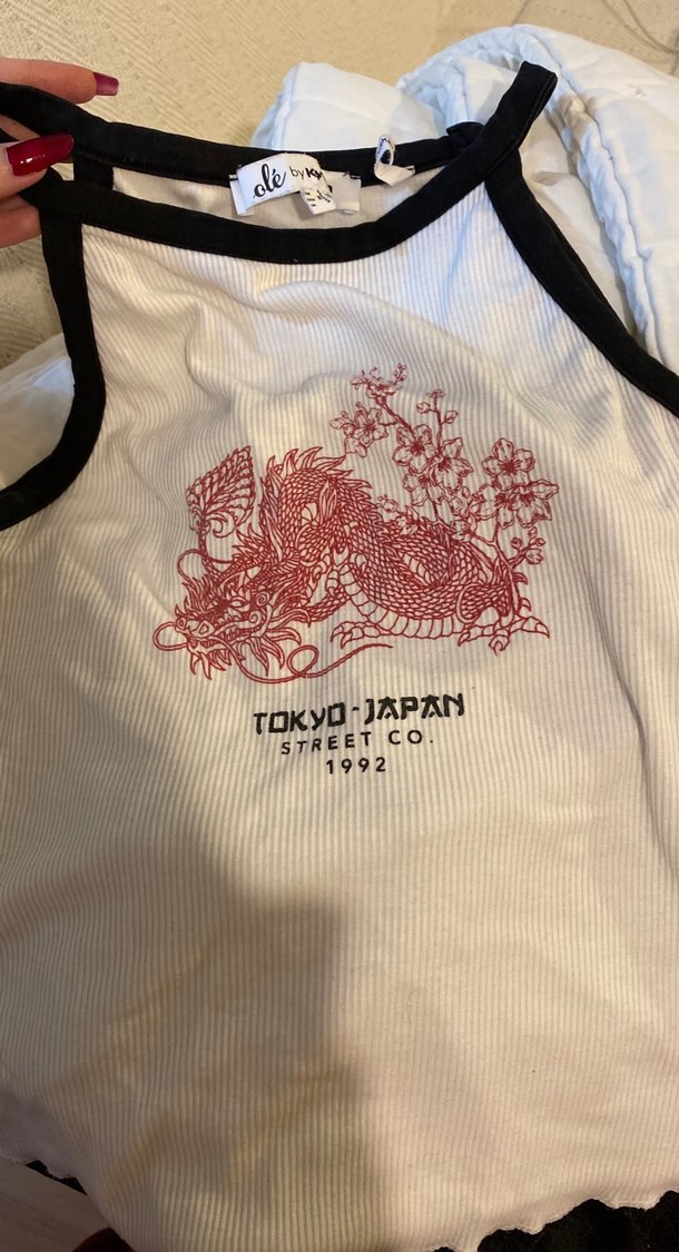 Bu beyaz, baskılı, kadın üstü, "TOKYO JAPAN STREET CO. 1992" yazılı ejderha desenine sahiptir. sokak stiline uygundur. birkac defa giyildi. desenin baskısında hicbir problem yoktur.