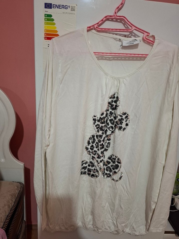Beyaz kadın tişörtü, uzun kollu ve bol kesimdir. Pamuklu yumuşak kumaştan, önünde baskılı desen bulunur. Günlük rahat kullanıma uygundur.