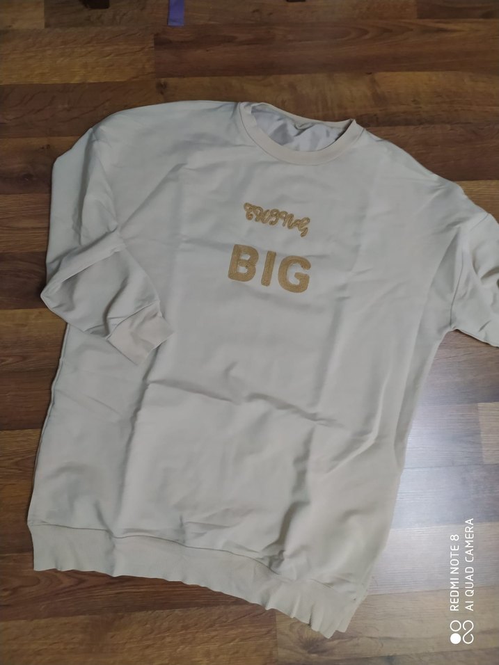Beyaz renkli, uzun ve bol kesim sweatshirt, yuvarlak yaka ve parlak baskı detaylarıyla günlük rahat kullanım için uygundur. buyuk beden 44.46 salas basen altı.
