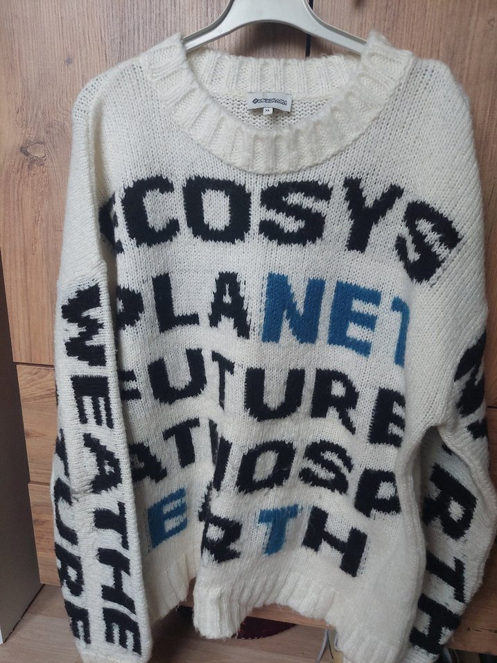 Beyaz renkli, yün malzemeden örülmüş, bol kesim ve uzun kollu kadın kazak. Baskılı desenli, normal midi boyda, günlük kullanıma uygun rahat bir model.