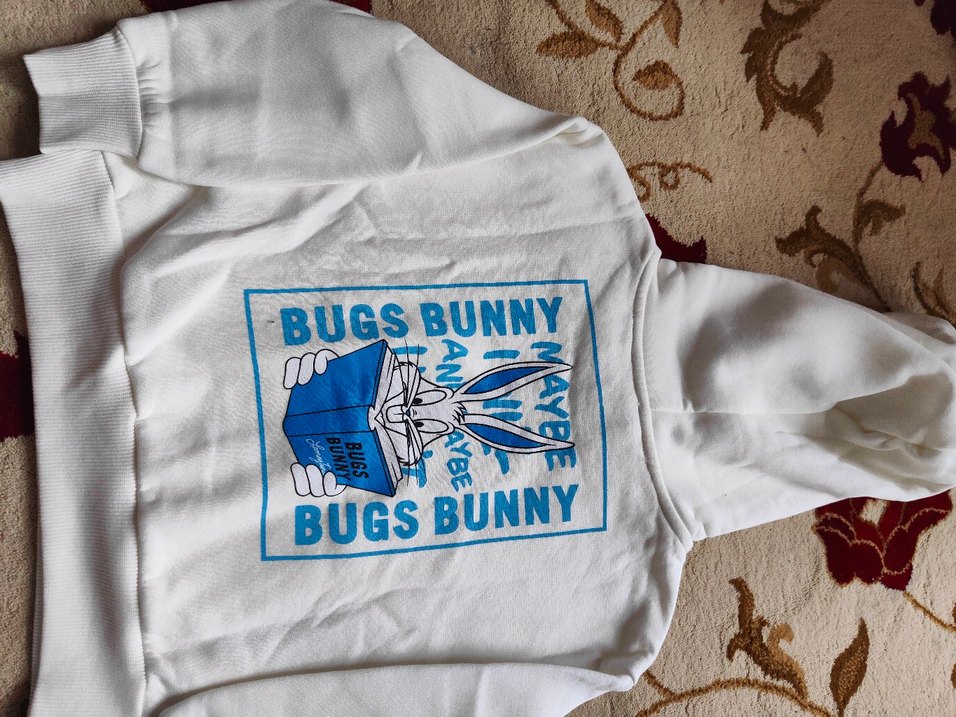 Beyaz, kapüşonlu, uzun kollu, pamuklu, baskılı Bugs Bunny figürlü. mavi sweatshirt orijinal 4/5 yaş kullanılmamış sıfır