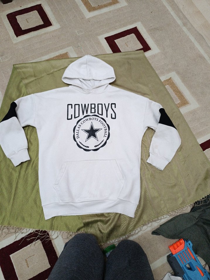 Beyaz renkli, kapüşonlu ve uzun kollu kadın sweatshirtü. Yumuşak ve sıcak kumaştan, bol kesim. Cowboys baskılı, fermuarlı detaylı, günlük rahat kullanım için uygun.