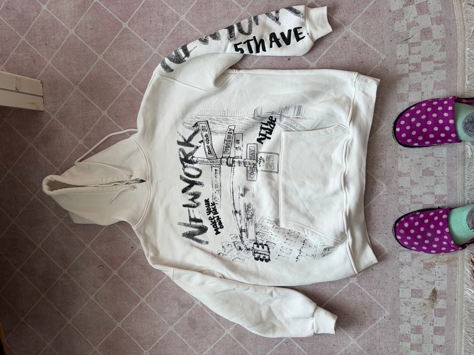 Pamuklu beyaz sweatshirt, kapüşonlu ve uzun kollu, bol kesim. Üzerinde '5TH AVE' yazılı New York baskısı bulunur. Günlük kullanıma uygun rahat bir parça. ️ S ve m arası L bedene bile olur Standart çok güzel kalıp
