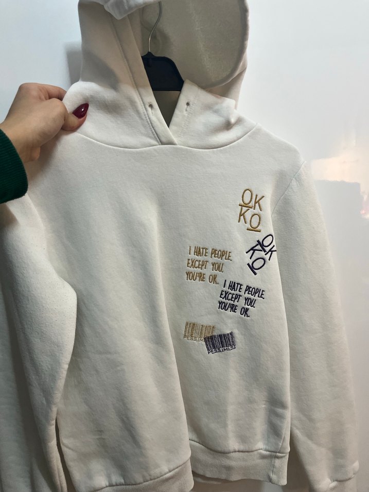 Beyaz, baskılı yazılı detaylara sahip, kapüşonlu ve rahat kesimli sweatshirt. Yumuşak ve sıcak kumaştan üretilmiş, uzun kollu ve normal boyda. Günlük sokak stili için uygun, zahmetsiz şıklık sunar.