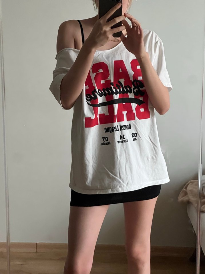 Beyaz pamuk tişört, kayık yaka, bol kesim ve büyük baskılı desenle sportif ve günlük stil için uygundur. ⚽