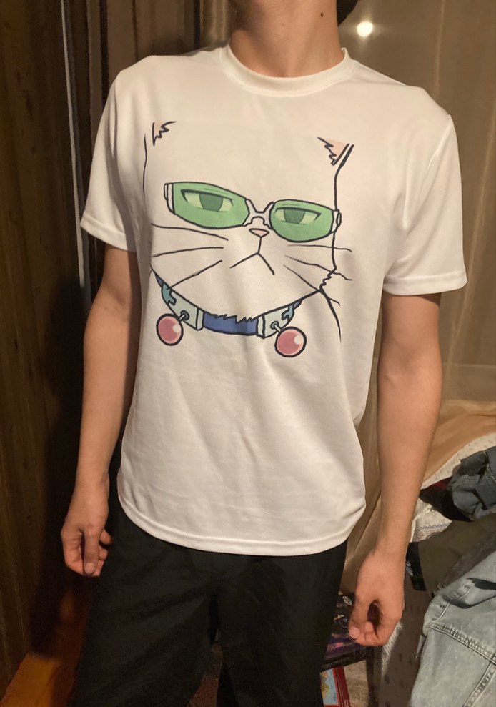 Beyaz tişört, pastel yeşil gözlüklü ve tokalı tasarımlı baskılı kedi figürü içerir. Rahat kesim ve sokak tarzı uyumlu.