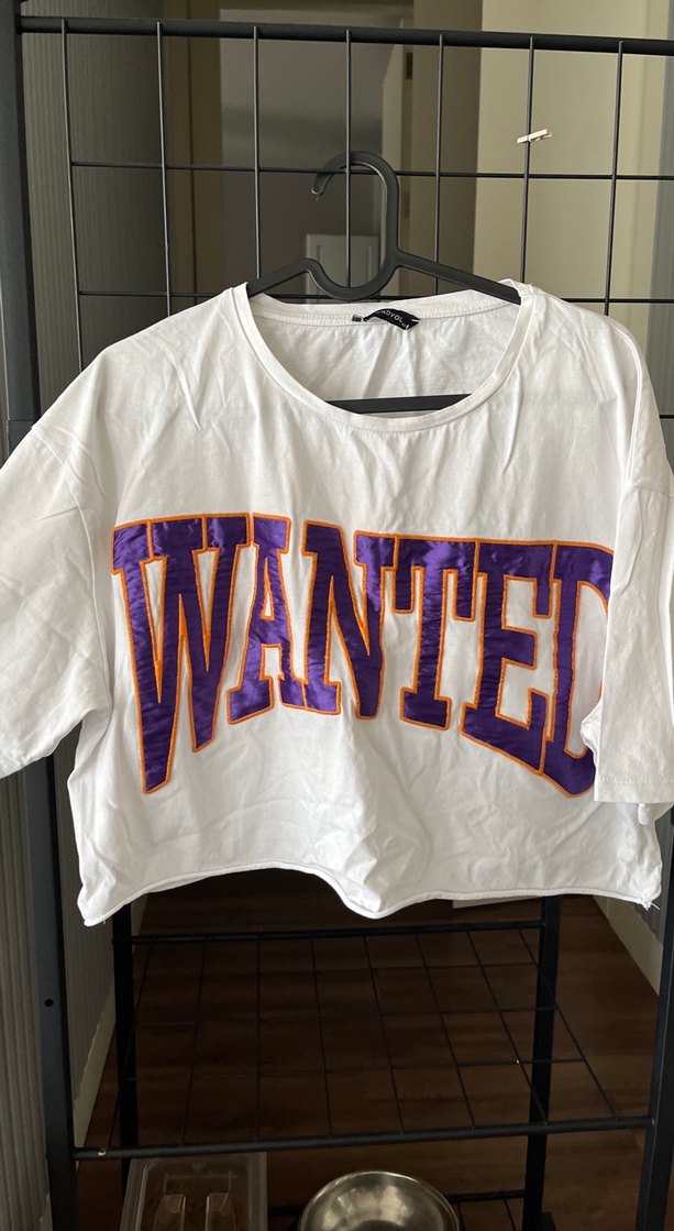 Beyaz, kısa kollu, bol kesim, yuvarlak yaka, parlak keten kumaştan, mor "WANTEL" baskılı, kemerli detaylı tişört. ️