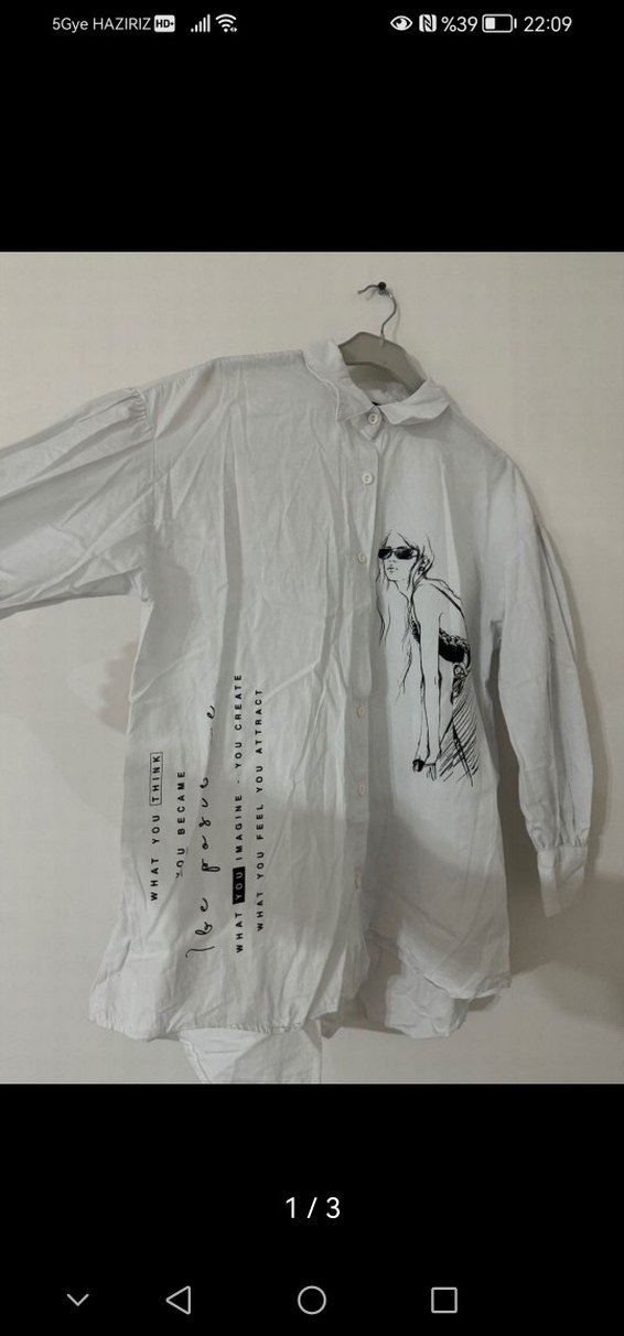 Beyaz keten gömlek, uzun kollu ve yakalı. Baskılı grafik ve yazı detayları, düğmeli ve bol kesim.
