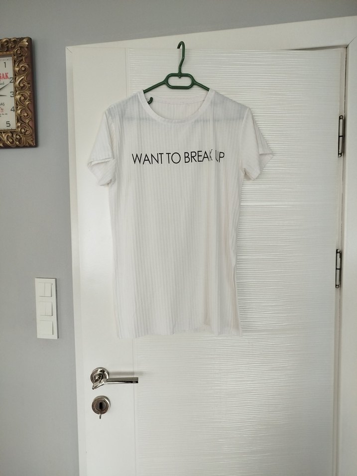 Beyaz keten kumaştan, kısa kollu ve yuvarlak yakalı bol kesim tişört. Önünde "WANT TO BREAP" yazılı baskı bulunur, rahat günlük kullanım için uygundur. iç göstermez köyü rengi belli eder
