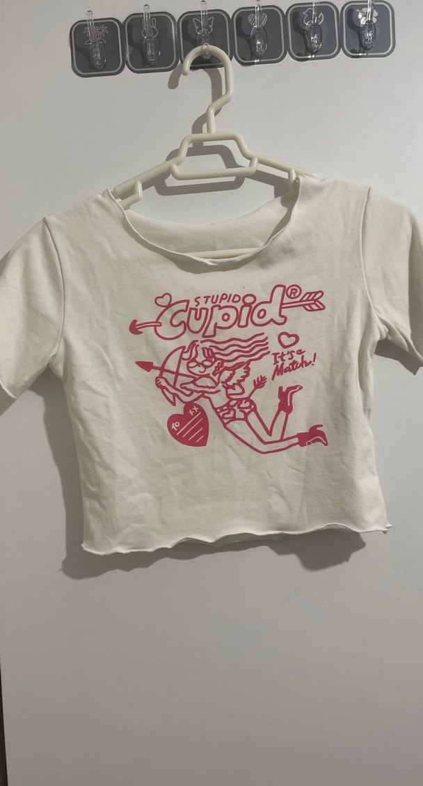 Pamuklu beyaz crop tişört, kısa kollu ve bisiklet yaka. Pastel pembe baskılı Cupid deseniyle rahat ve şık bir sokak stili sunar. Kumaşı çok iyi