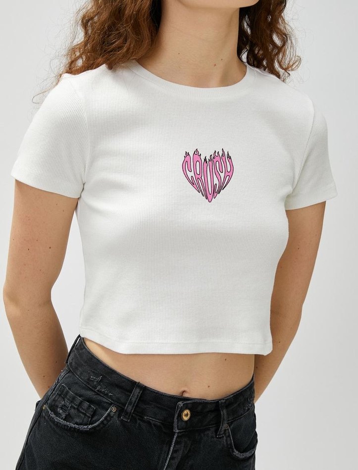 Beyaz Baskılı Kısa Crop Top