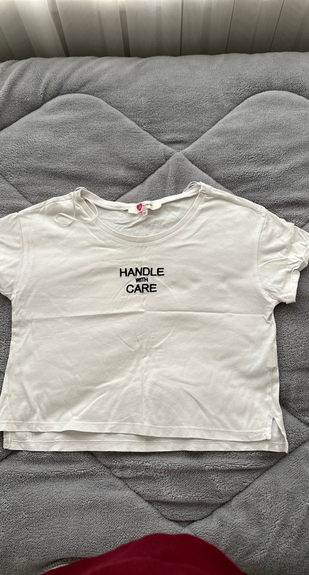 Pamuk kumaştan, baskılı "HANDLE WITH CARE" yazılı beyaz, kısa kollu, yuvarlak yaka, bol kesim basic tişört. Rahat sokak stili ile günlük kullanıma uygun.
