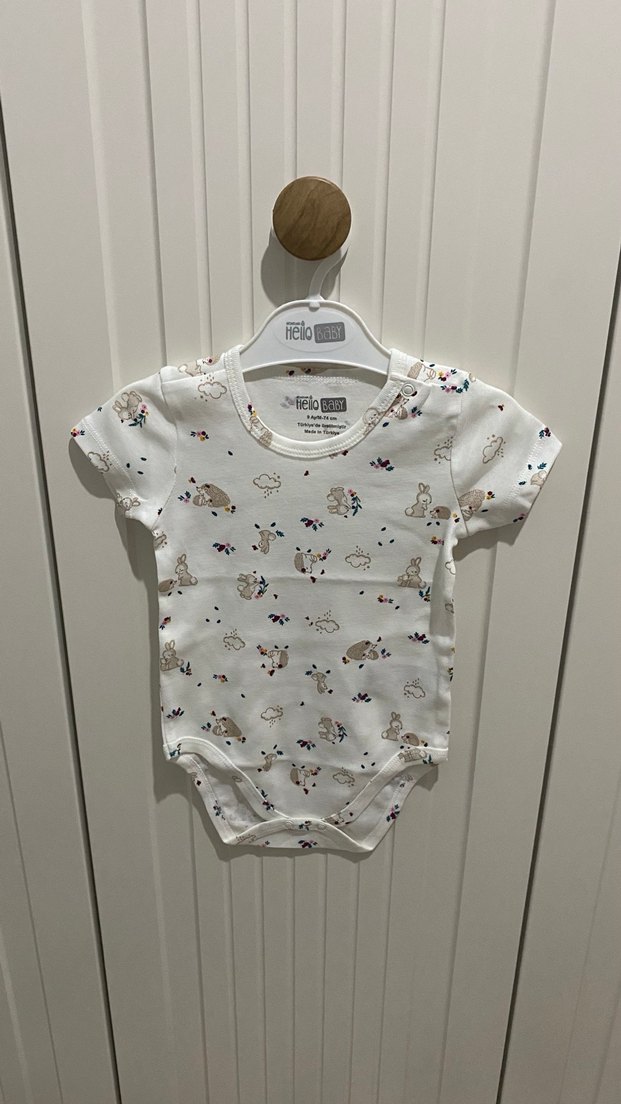 Beyaz, kısa kollu, yuvarlak yakalı bebek çıtçıtlı body, pastel renkli baskılı deseniyle zahmetsiz şıklık sunar. 2li üründür