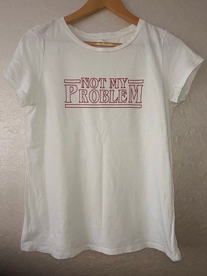 Beyaz tişört, kısa kollu ve yuvarlak yaka.