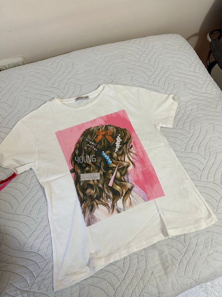 Pamuk kumaştan, beyaz, kısa kollu, pastel renklerde baskılı kısa kesim tişört. Bisiklet yaka ve bol kesim ile rahat bir sokak stili sunar.
