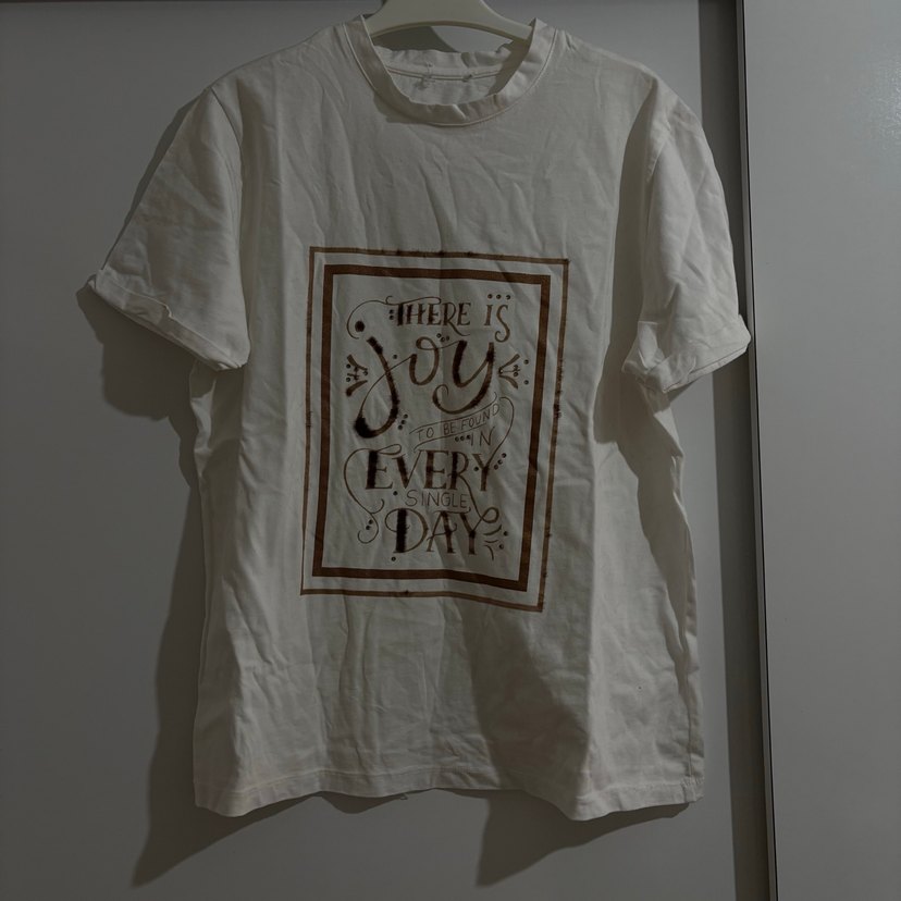 Pamuklu, beyaz renkte, kısa kollu ve yuvarlak yakalı bol kesim tişört. Üzerinde 'There is joy to be found every single day' yazılı baskı bulunur. Günlük rahat stil için uygun.