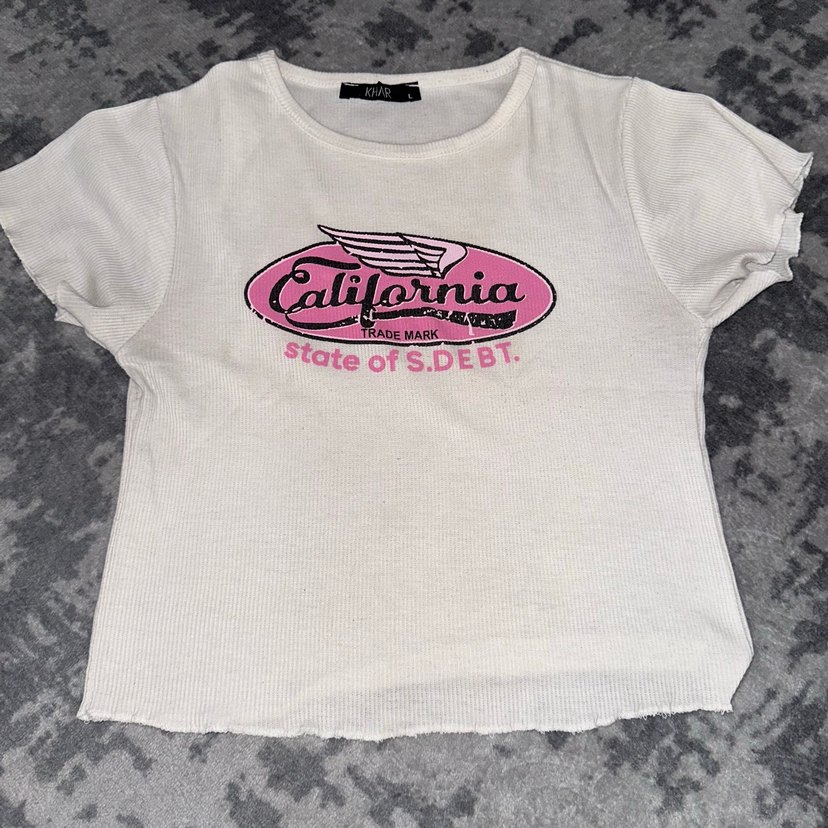 Pamuk kumaştan, kısa kollu ve bisiklet yaka, fitted kesim kadın tişörtü. Pastel beyaz renk, vintage California baskısı ve düğme detaylarıyla günlük kullanıma uygun.