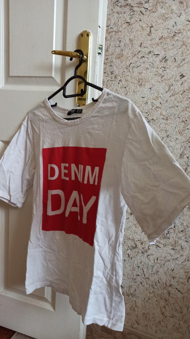 Beyaz pamuklu kumaştan, baskılı ve bol kesim kısa kollu tişört. Önünde 'DENM DAY' yazısı bulunur, rahat ve günlük tarz sağlar.