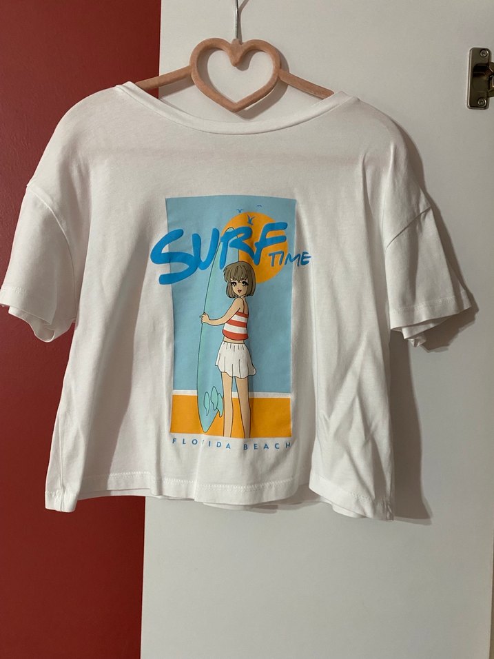 Beyaz pamuk tişört, kısa kollu ve bol kesim. Canlı baskılı plaj temalı tasarıma sahip, rahat kullanım için uygundur. Sorunsuz yeni gibi 9-10 yaş