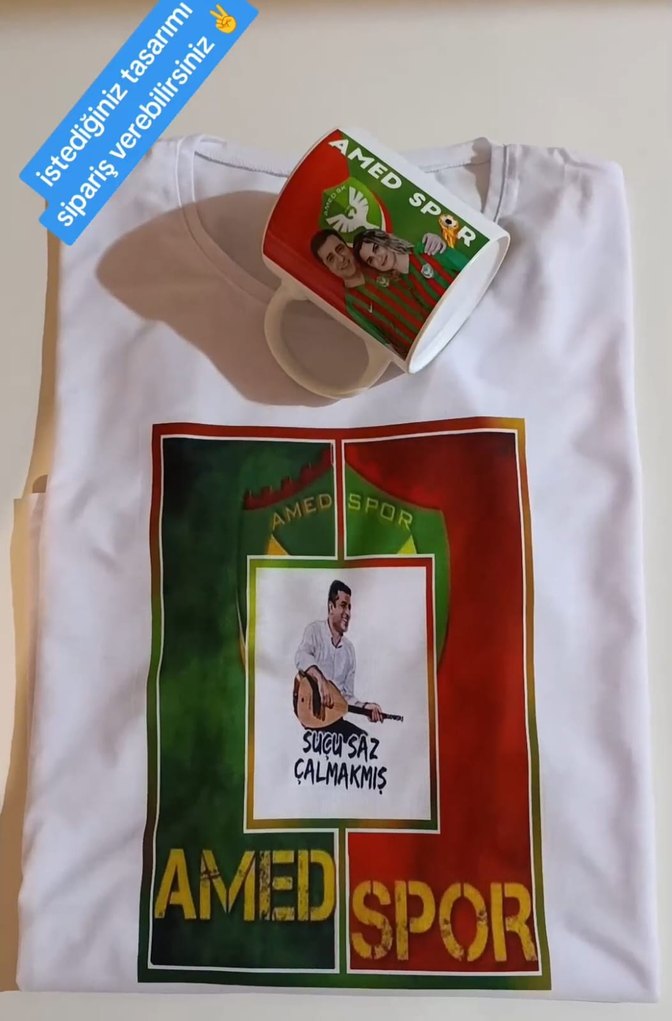 Beyaz pamuk tişört, renkli baskılı 'AMED SPOR' ve saz çalan adam görseli ile. Yuvarlak yaka, kısa kollu, regular fit ve cırt cırt detaylıdır. Sokak tarzı için uygundur.