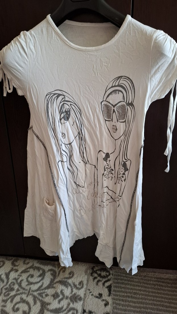 kısa kollu, bol kesim tişört. Önünde baskılı desen ve drapeli detaylar bulunur.