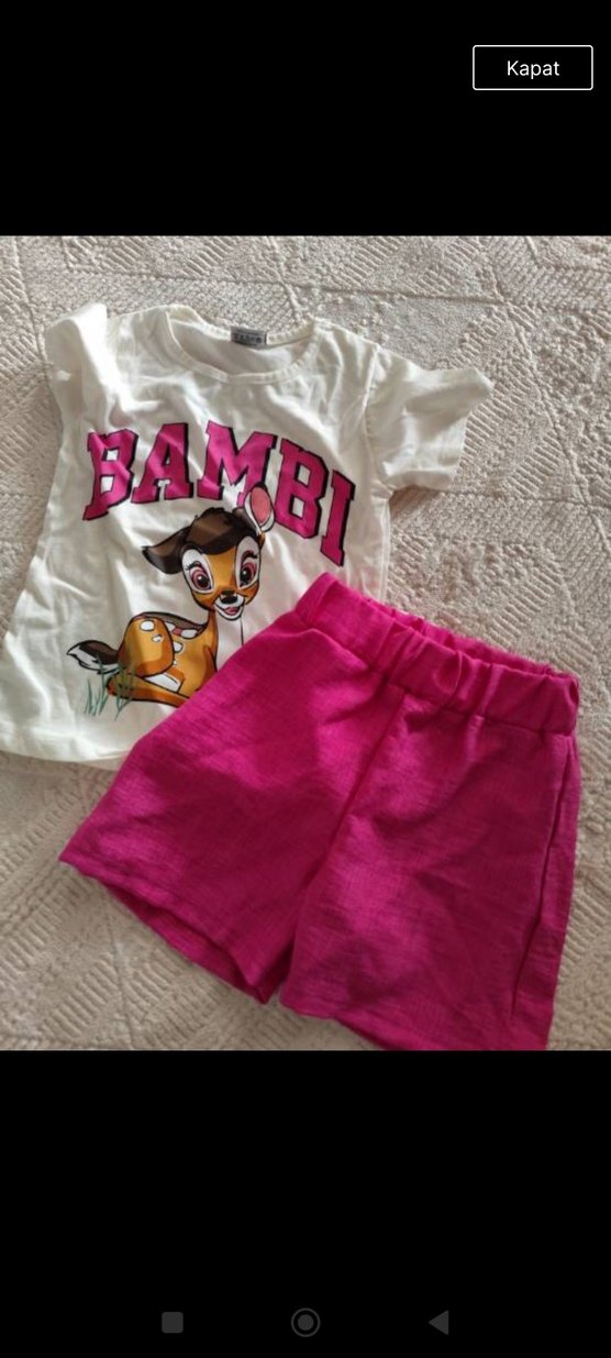 Beyaz kısa kollu üstte renkli Bambi baskısı ve pembe örgü şort bulunan rahat ve canlı bebek kıyafeti.