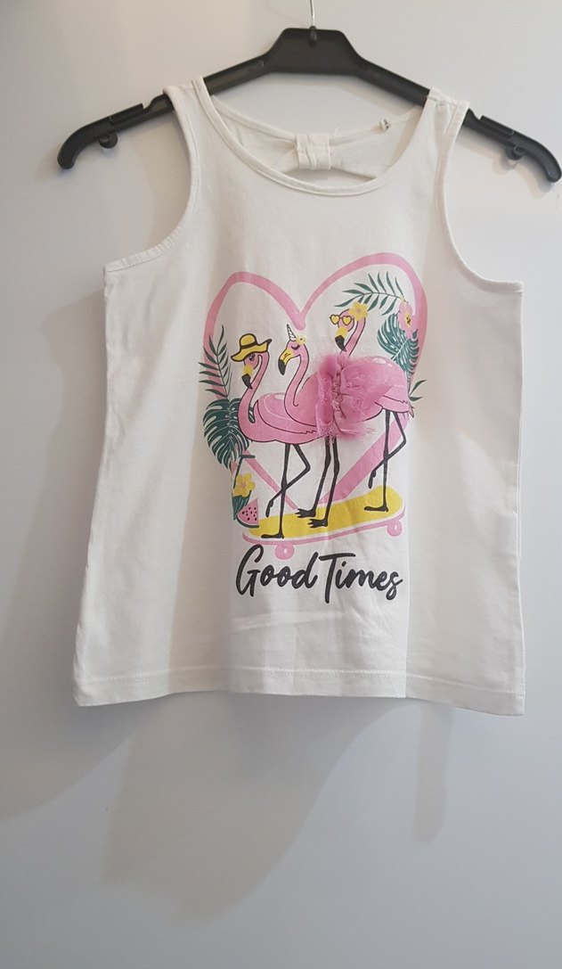 Beyaz pamuklu askısız tişört, renkli flamingo baskısı ve 3D çiçek detayı ile bohem tarzda, bol kesim sokak giyimi için uygundur.