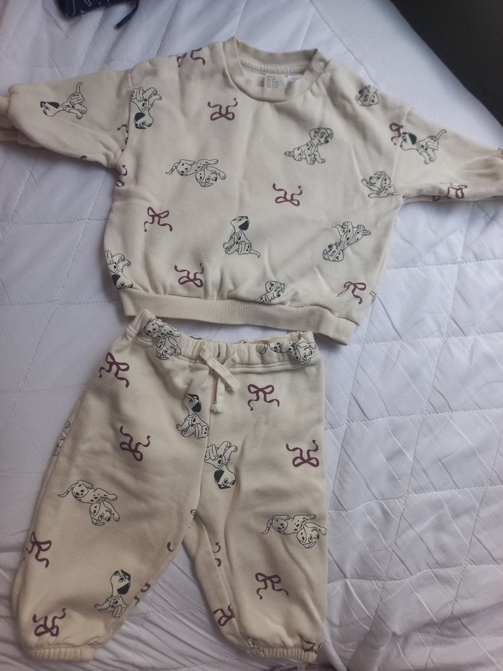 Beyaz renkli, baskılı kız çocuk eşofman takımı, bol kesim, yuvarlak yaka ve uzun kollu, yumuşak örme kumaştan rahat sokak stili için uygun.