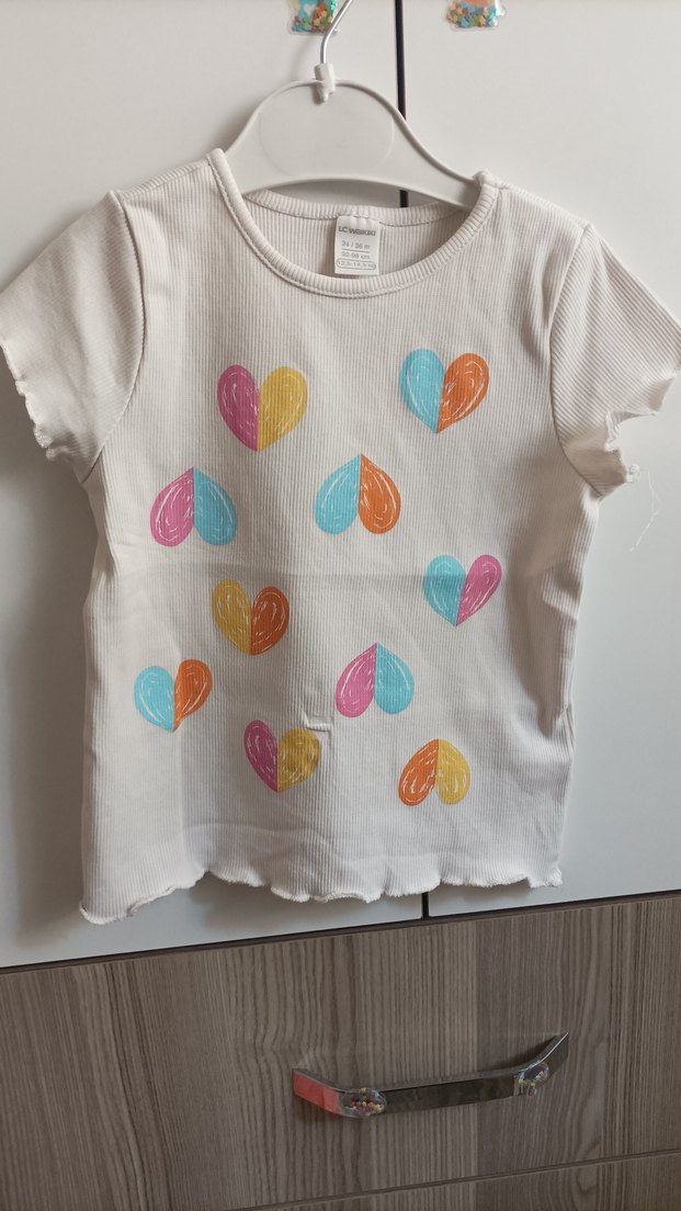 Pamuklu beyaz kız çocuk tişörtü, kısa kollu ve bol kesim. Renkli kalp baskıları ve yuvarlak yaka ile sokak stiline uygun.
