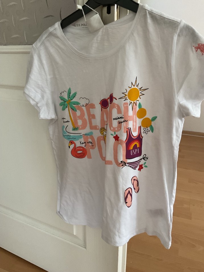 Beyaz pamuk kız çocuk tişörtü, kısa kollu ve yuvarlak yaka. Gevşek kesimi ve pastel baskılı deseniyle sokak modası tarzında.