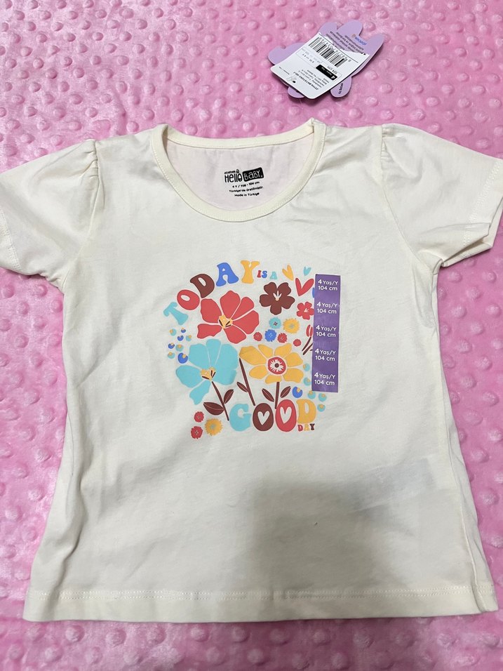 Beyaz pamuklu, kısa kollu, bisiklet yaka, bol kesim kız çocuk tişörtü. Renkli çiçek baskısı ile sokak modasına uygun.