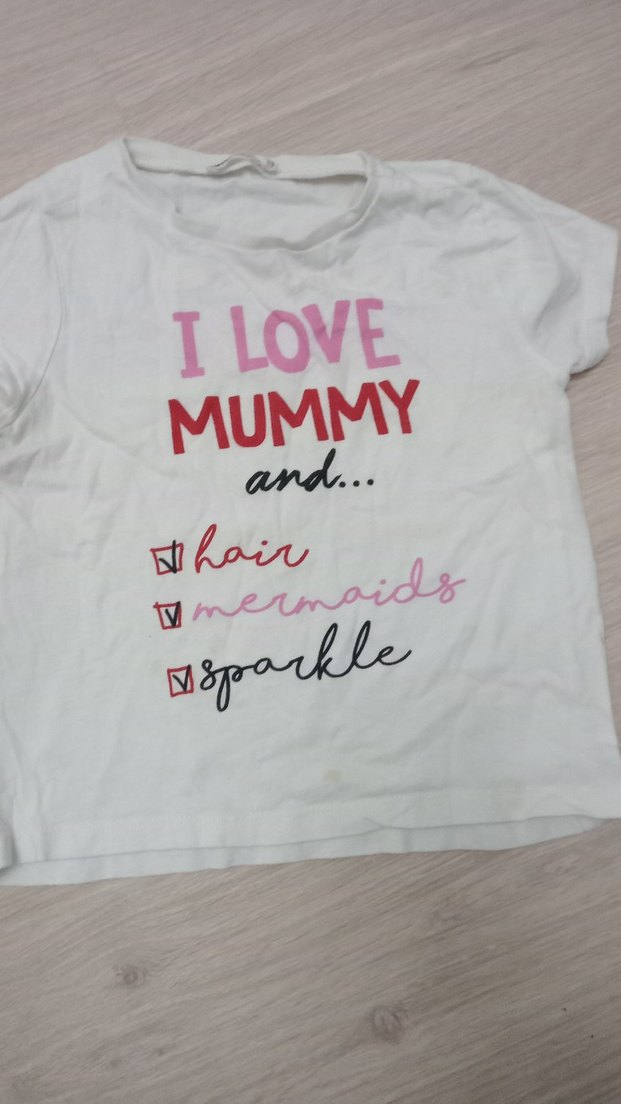 Pamuklu, beyaz renkli, baskılı ve rahat kesim kız çocuk tişörtü. Kısa kollu ve yuvarlak yaka. "I love Mummy and..." yazılı pastel desenli. #tşört#kazak#elbise#