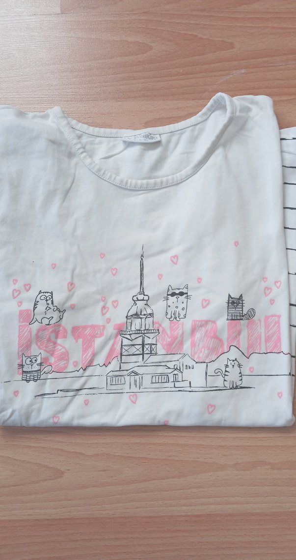 Beyaz renkli, kısa kollu. Paris temalı baskı ve ince çizgilerle tasarlanmış, pamuklu kumaştan üretilmiştir. dolabima göz atmayı unutmayın