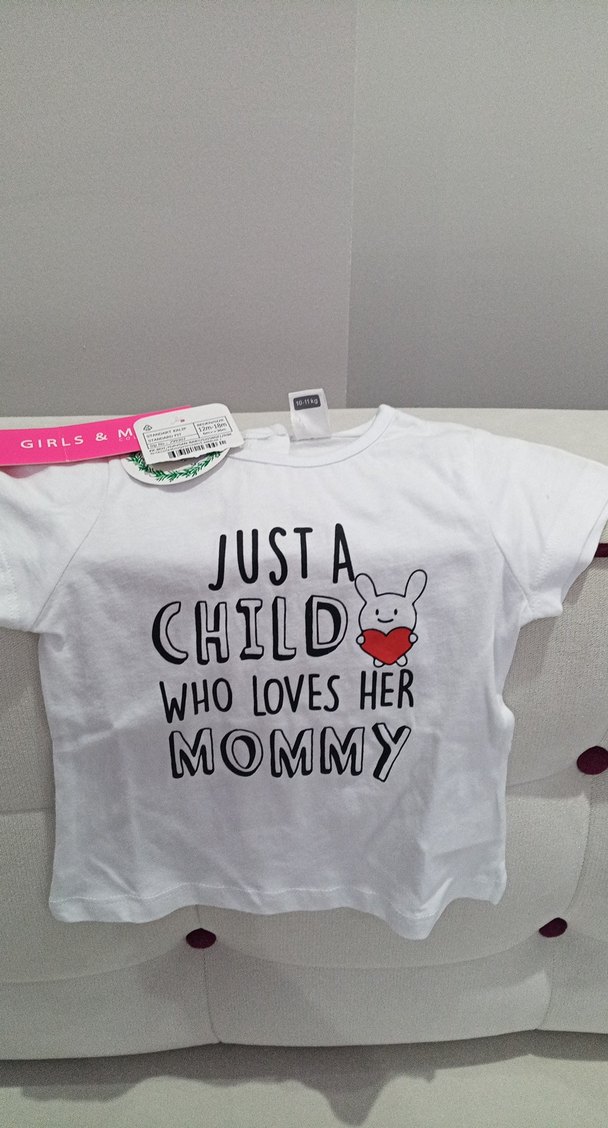 Pamuk beyaz kısa kollu kız çocuk tişörtü, renkli baskılı yazı ve sevimli grafikle. Salaş kesim ve yuvarlak yaka, sokak stili için uygun.